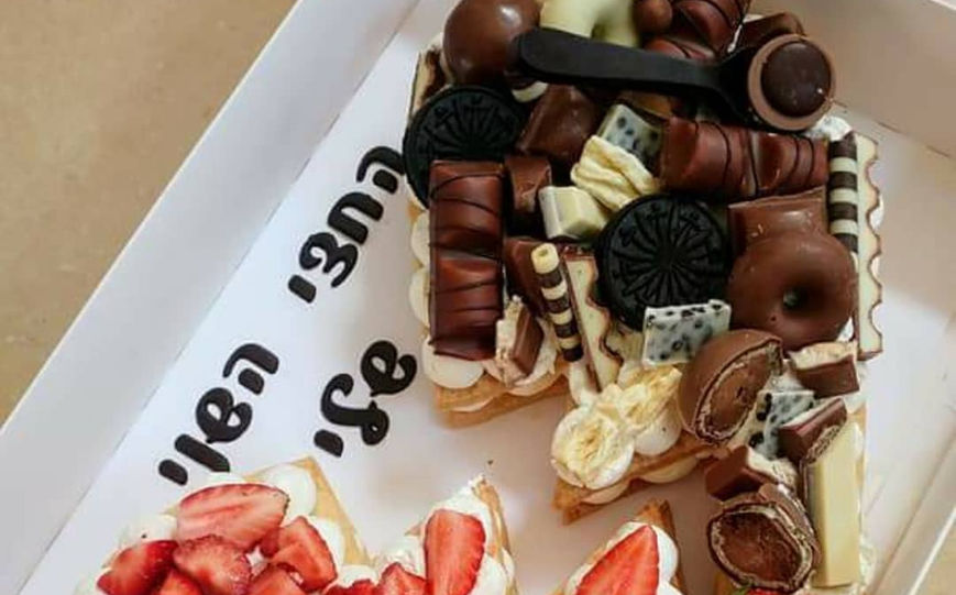 עוגות מלבניות גדולות מצופות בגנאש שוקולד עם תמונה מודפסת ועיטורי קצפת